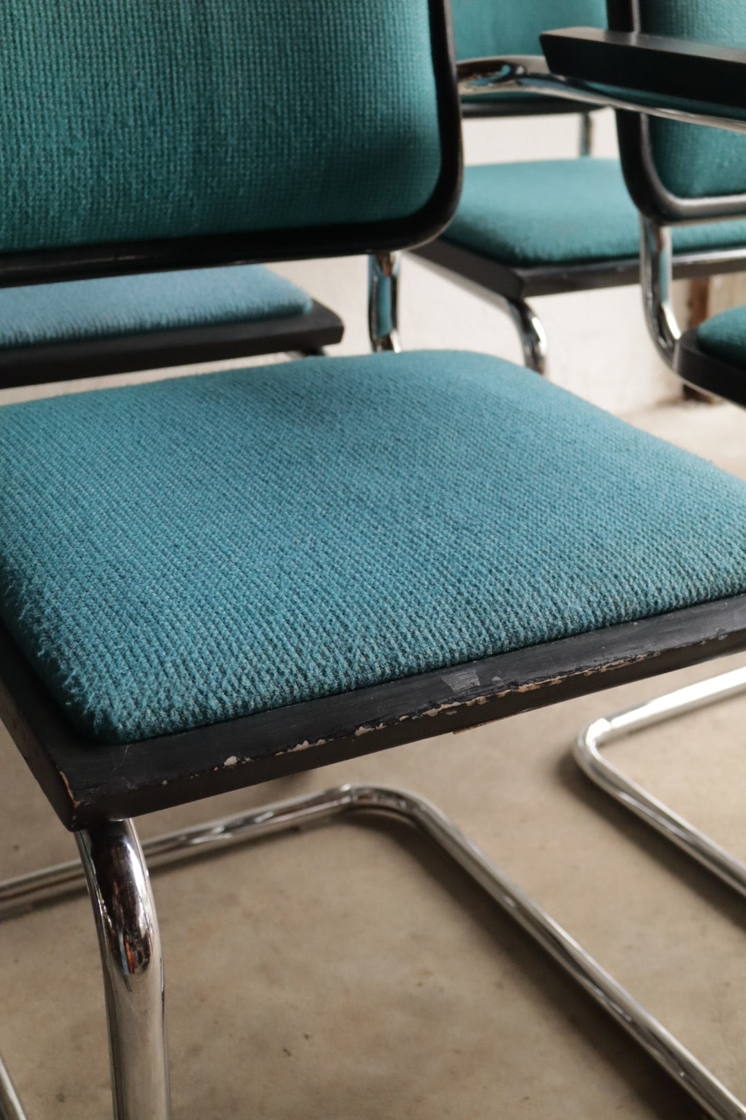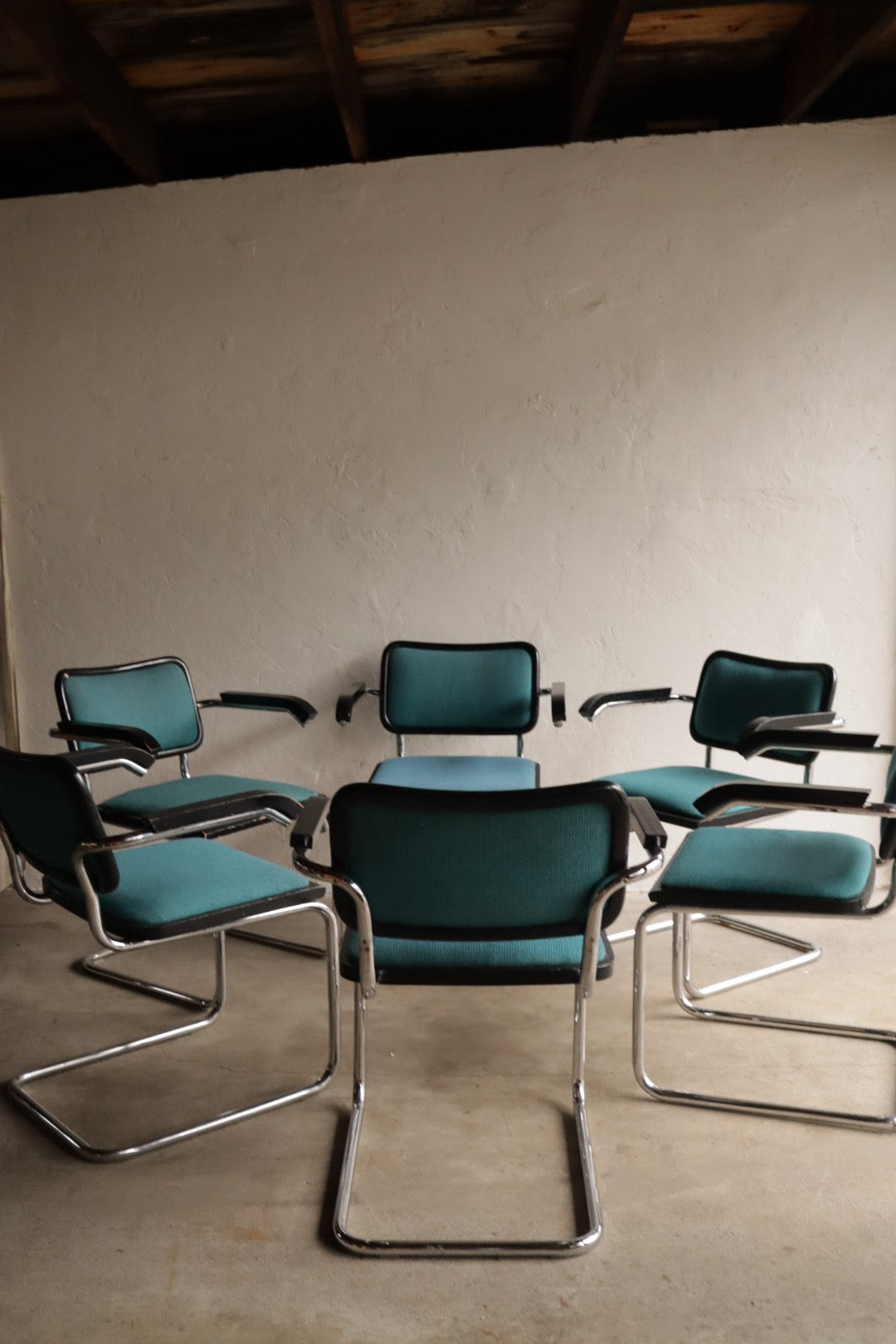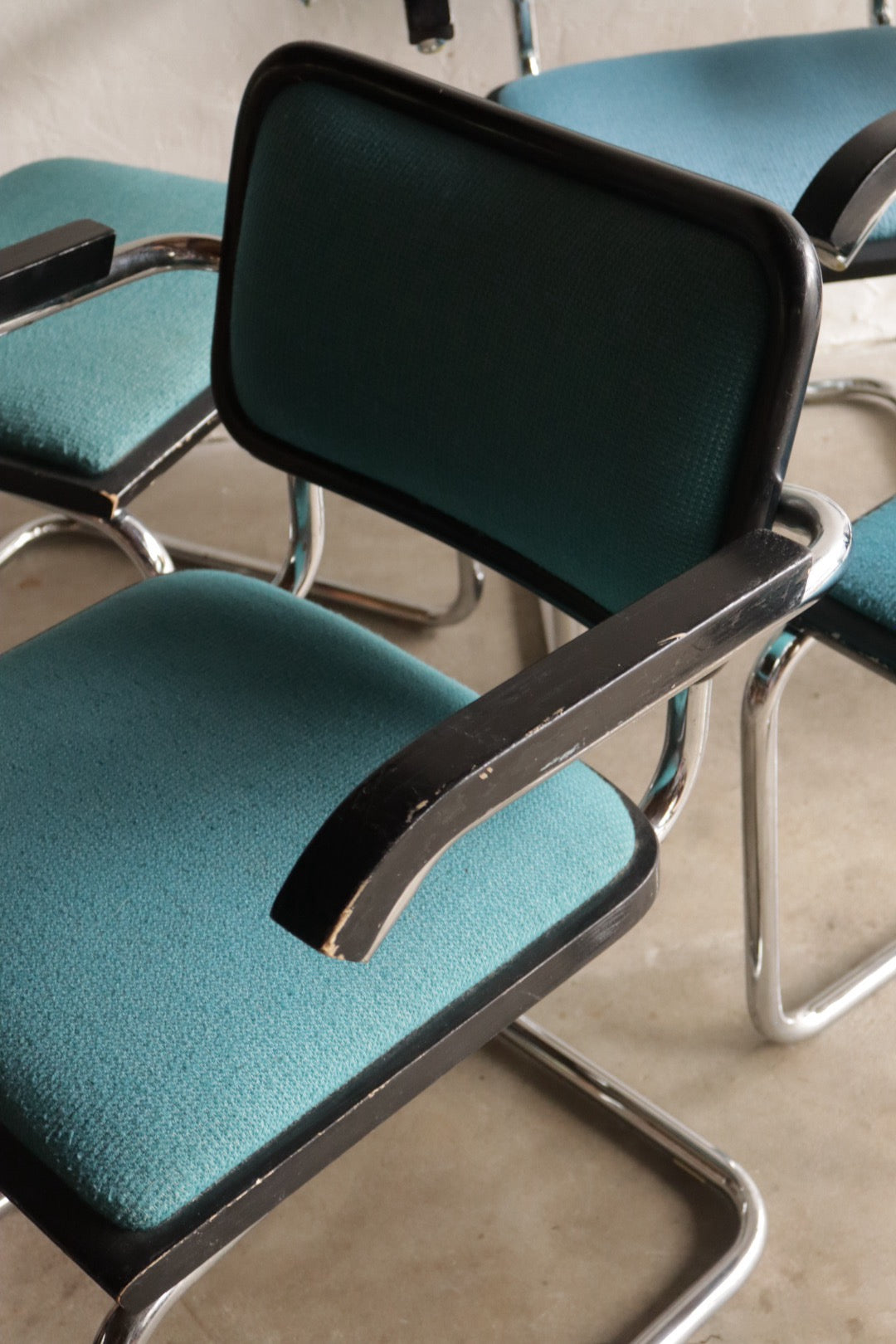 1970s cantilevered chrome frame chairs with wood arms and upholstered seats by Lowenstein.