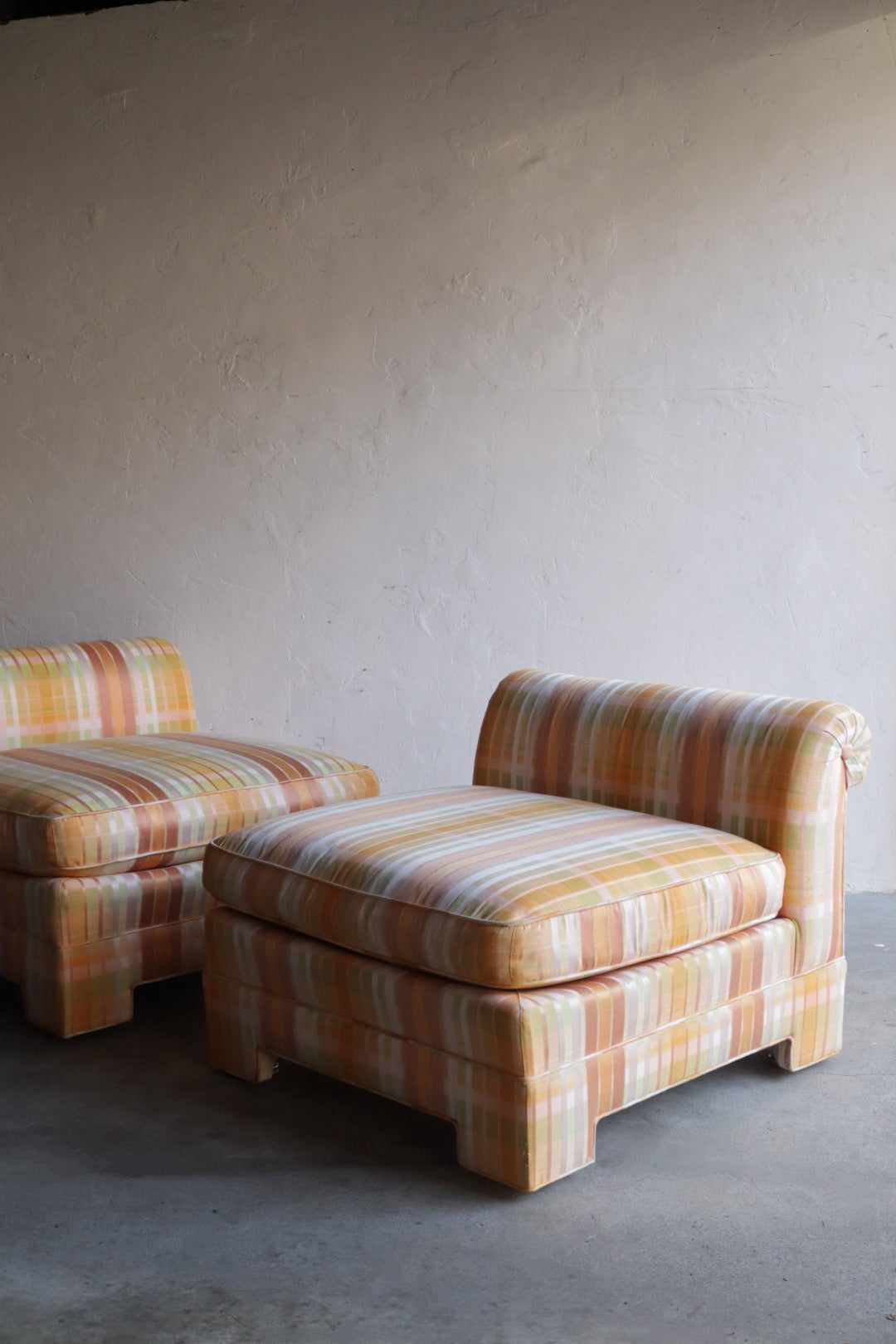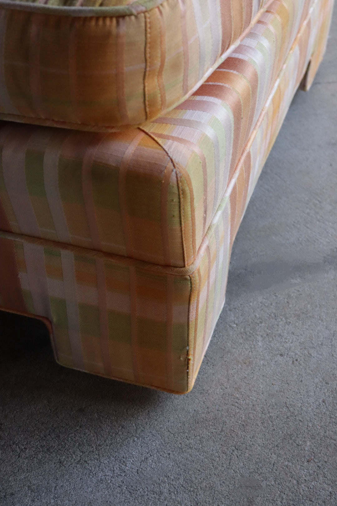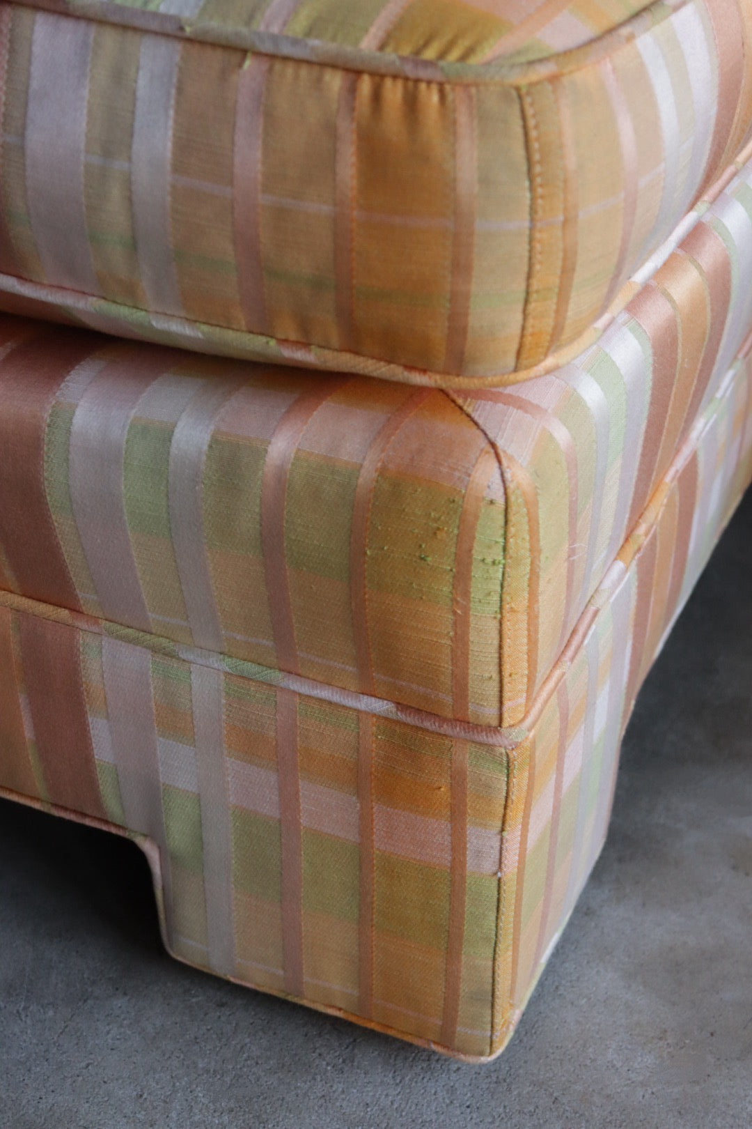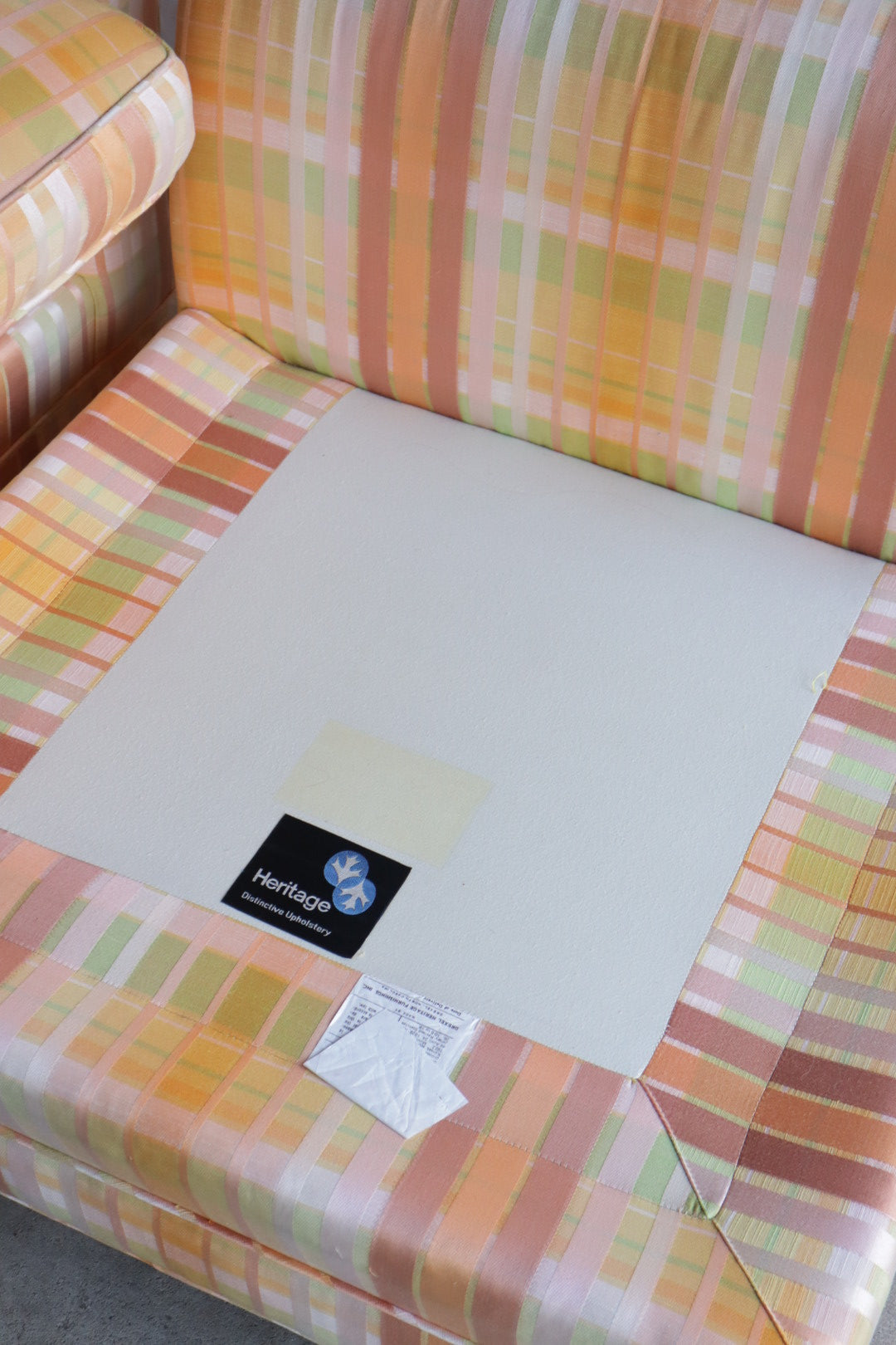 Pair of 1970s slipper chairs by Drexel, USA. Original plaid satin blend fabric is in excellent condition for age with minor flaws, see photos for details. Seat cushion is down filled.