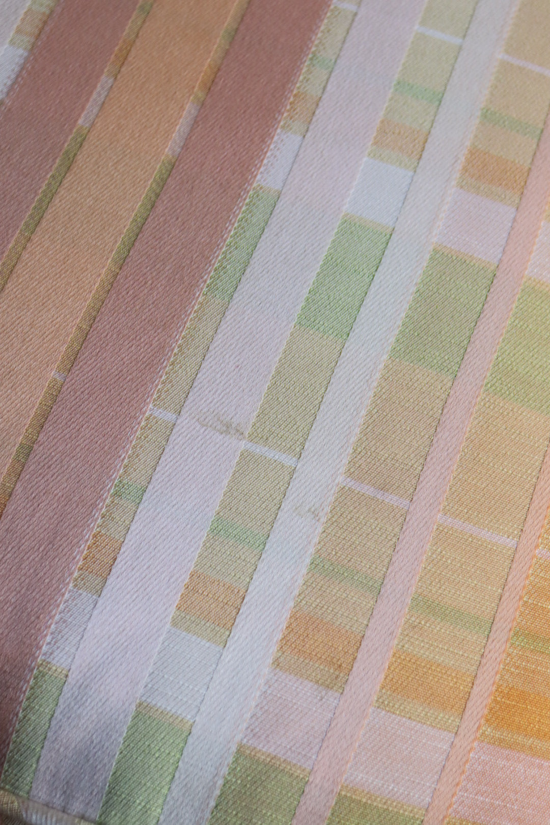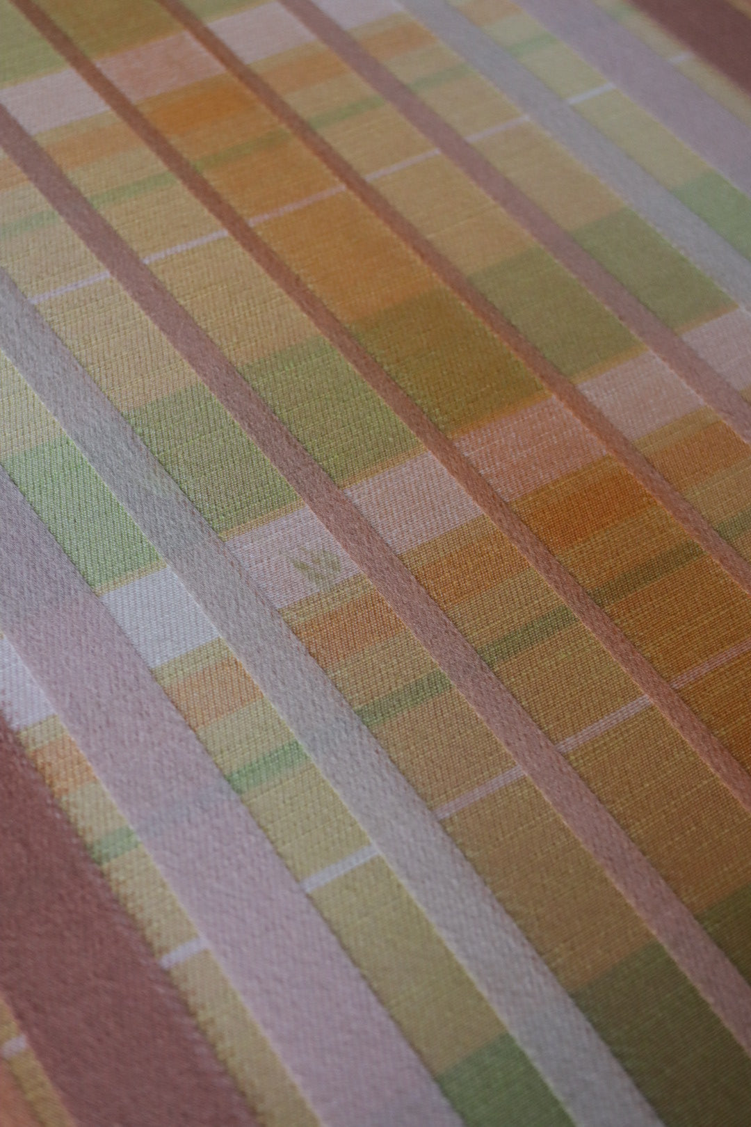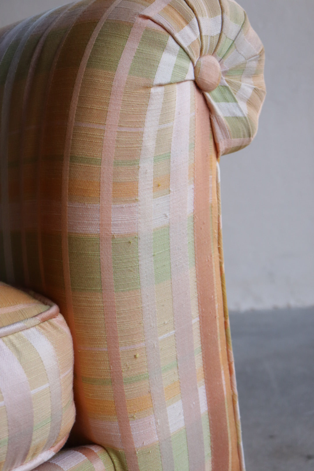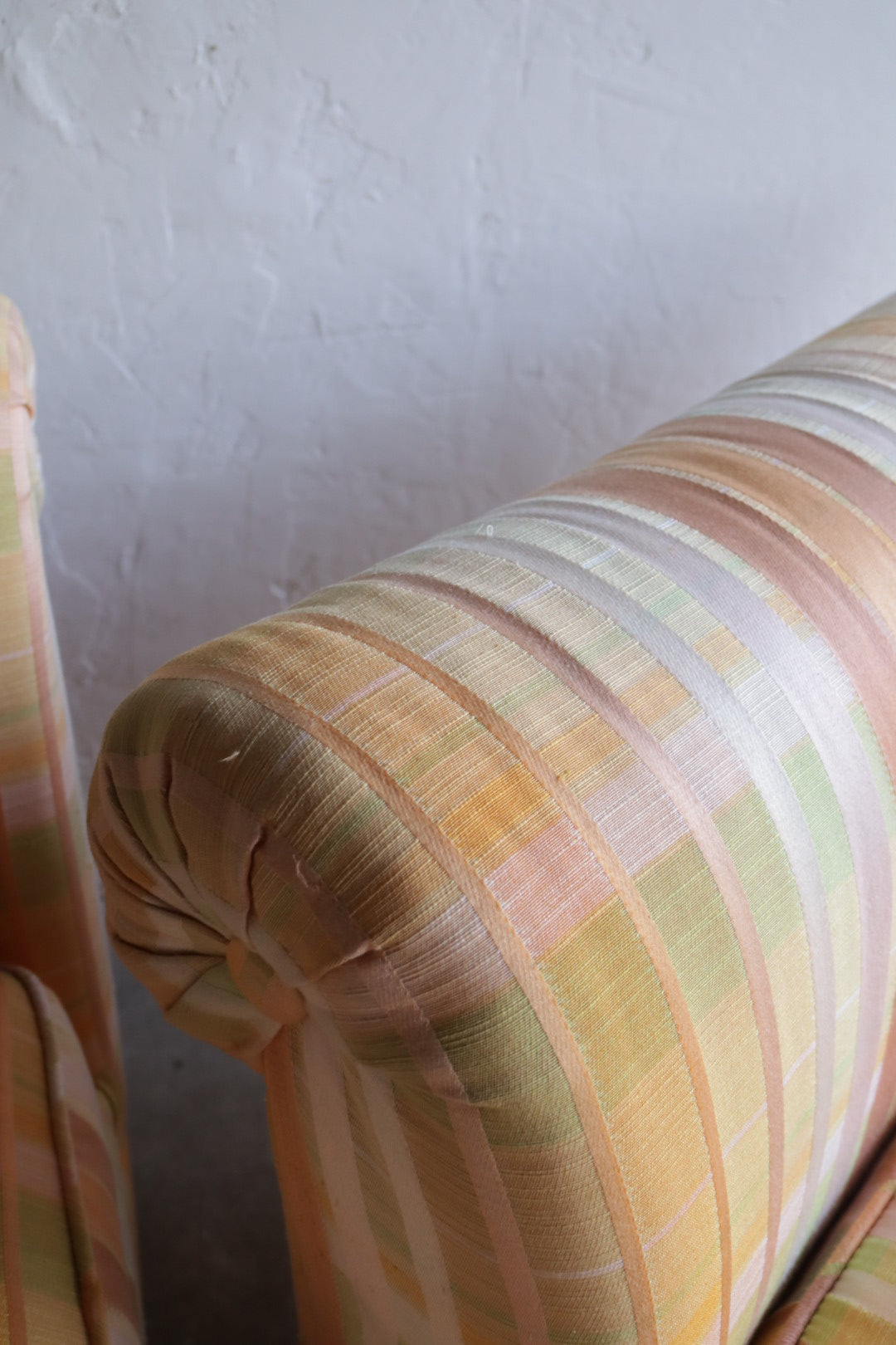 Pair of 1970s slipper chairs by Drexel, USA. Original plaid satin blend fabric is in excellent condition for age with minor flaws, see photos for details. Seat cushion is down filled.