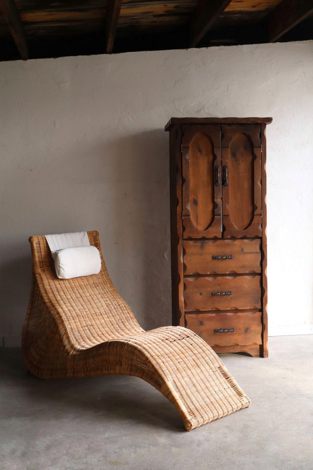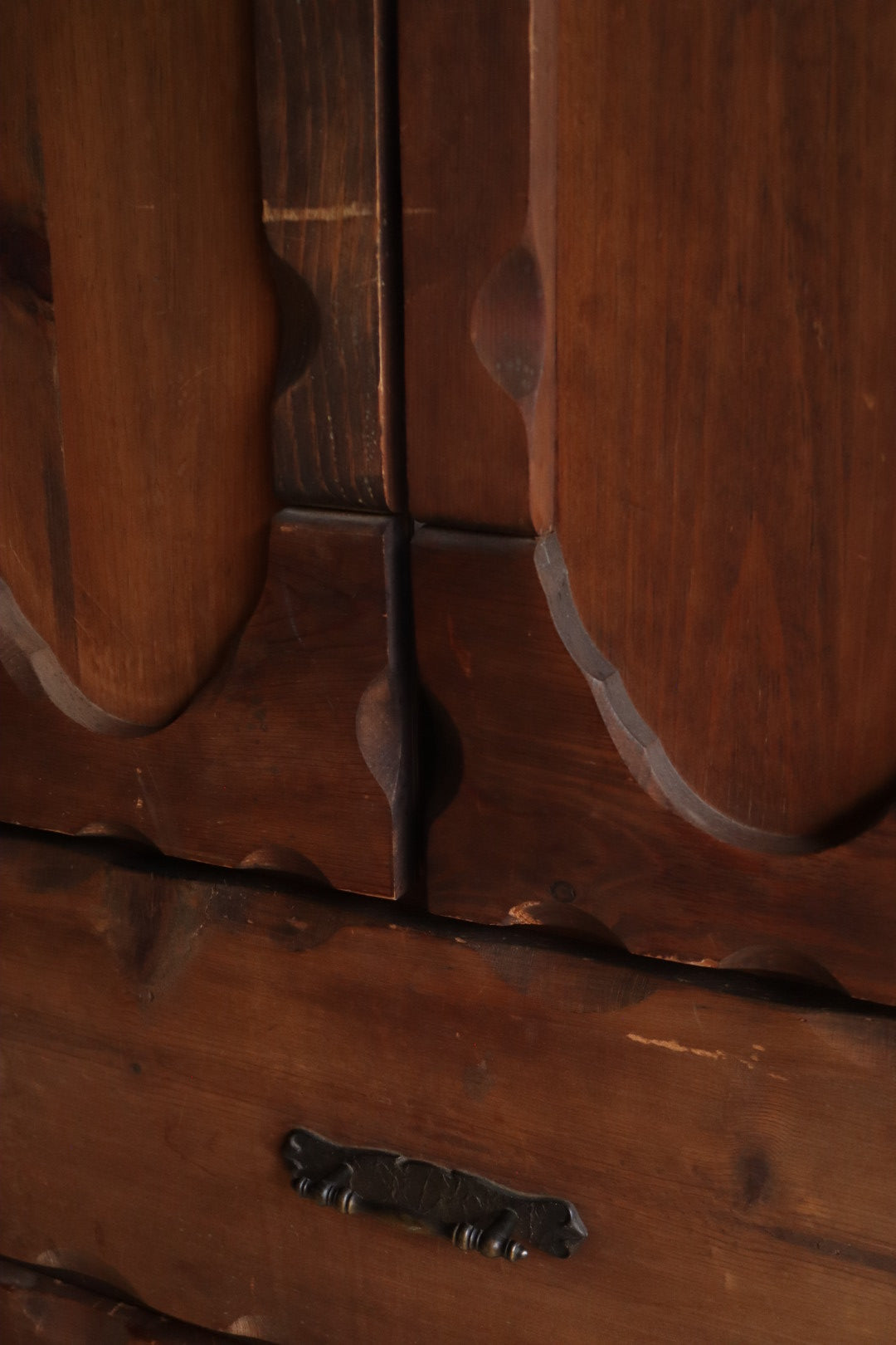 Rustic antique solid wood cabinet with carved details. Functional storage for any room of the home. Patina/vintage wear throughout, please see photos for details. Beautiful functional art that bring warmth and character to any space.