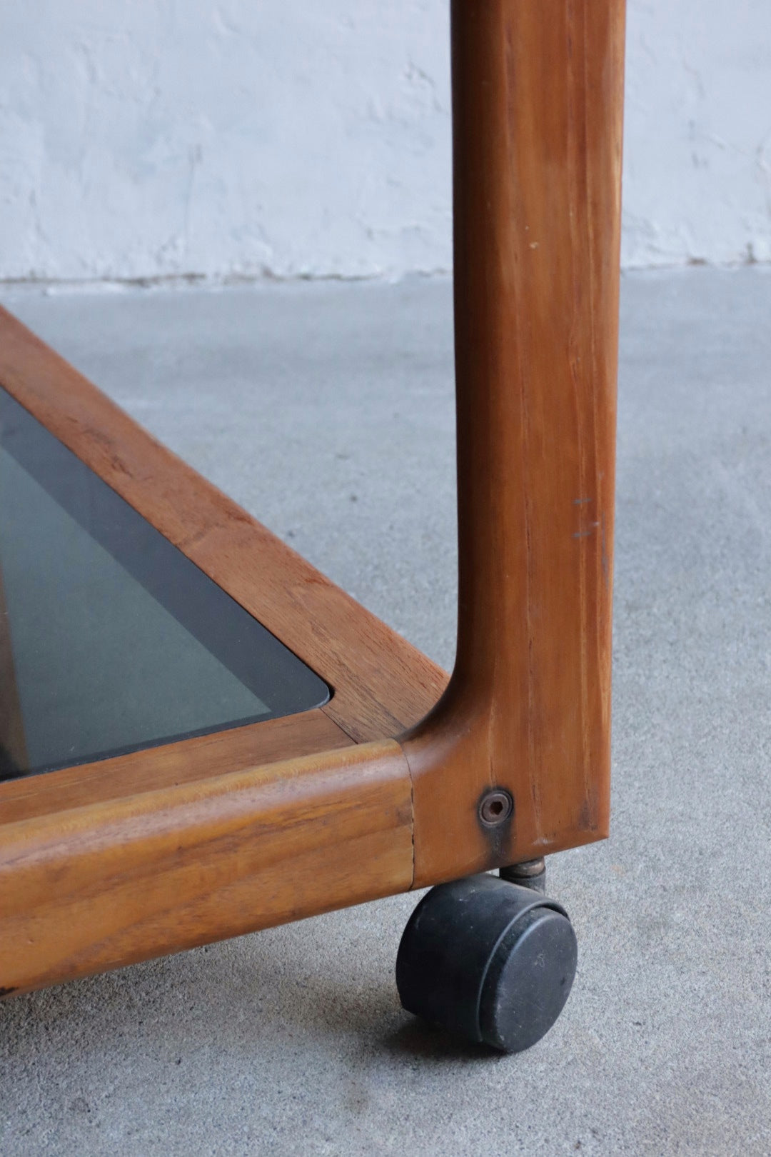 Danish Teak bar cart with smoked plexiglass shelving.