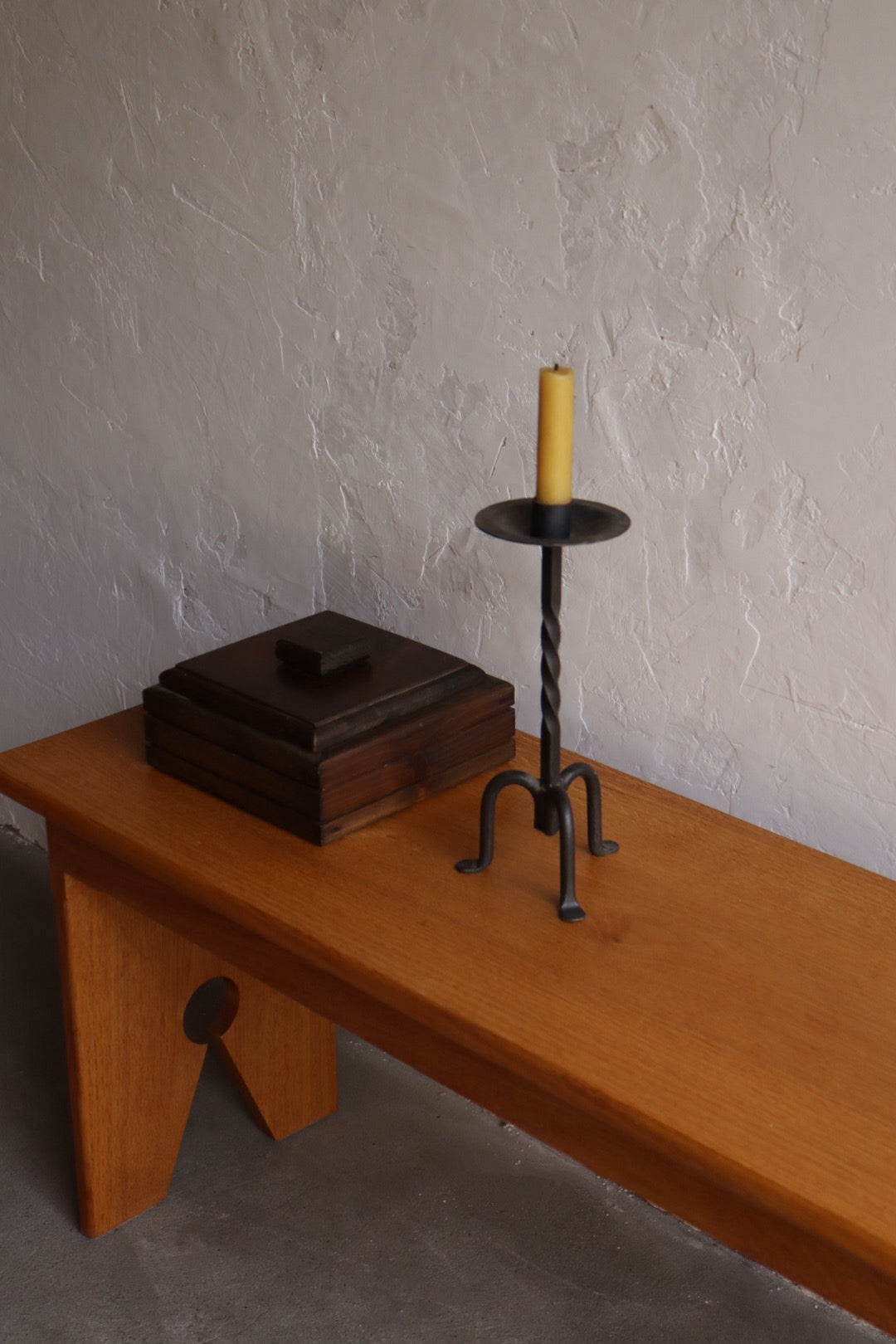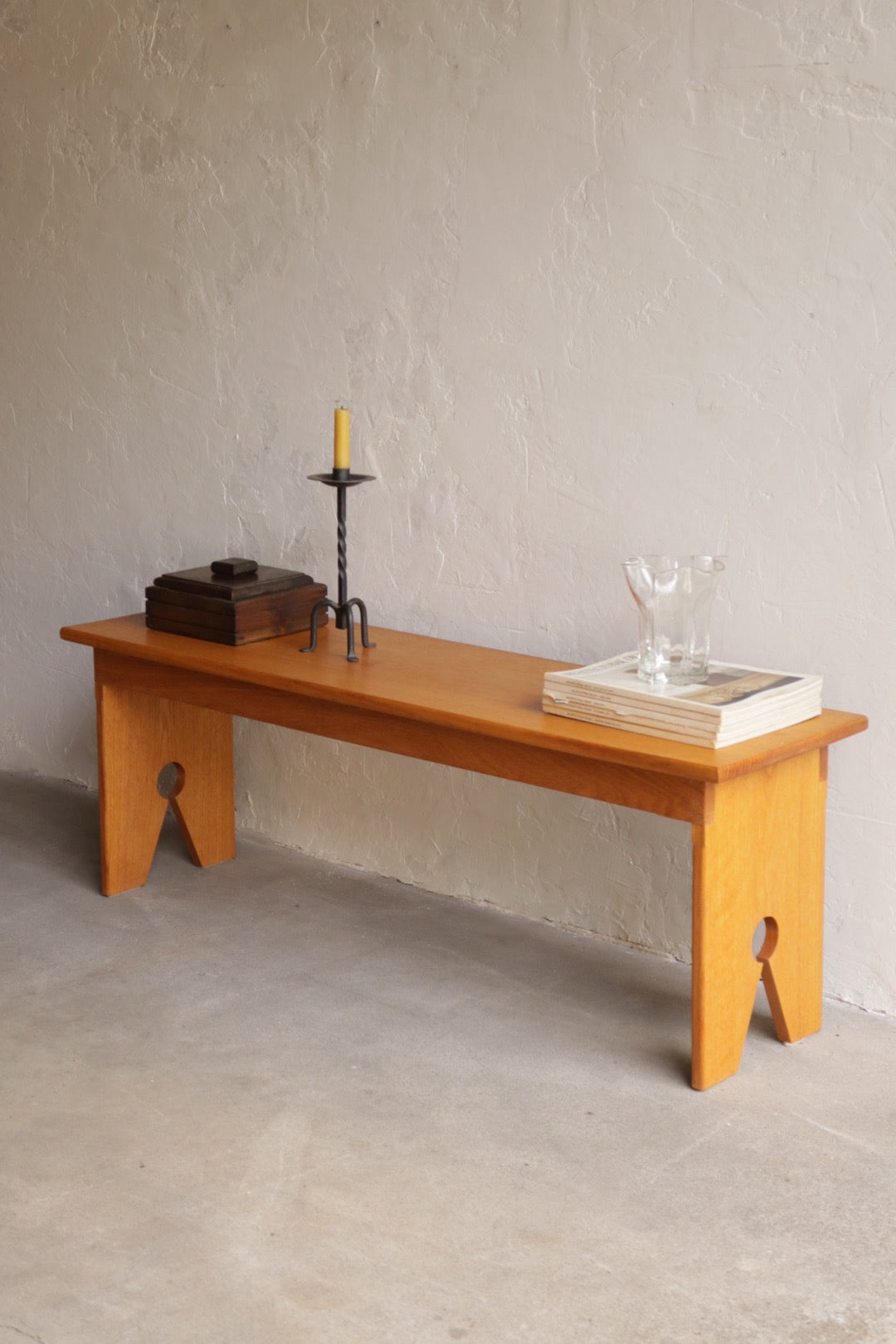 Vintage solid oak bench with unique keyhole legs. Versatile piece that can be used in an entryway, foot of the bed, coffee table, etc.