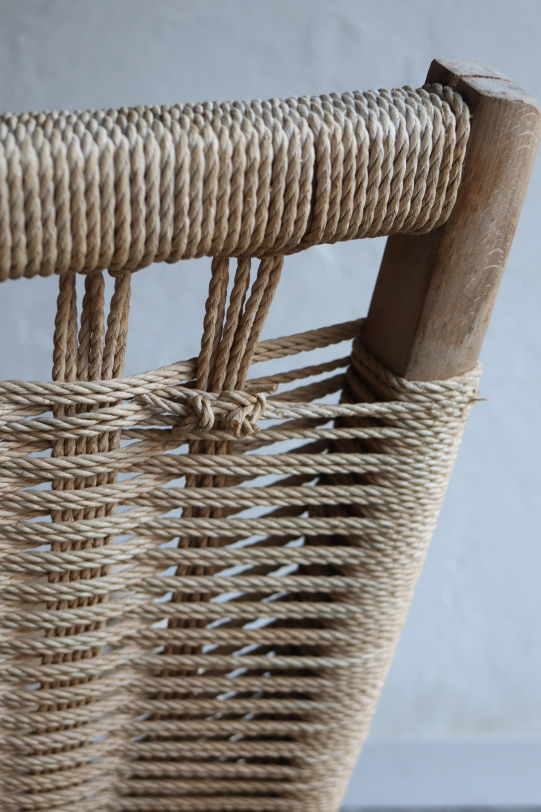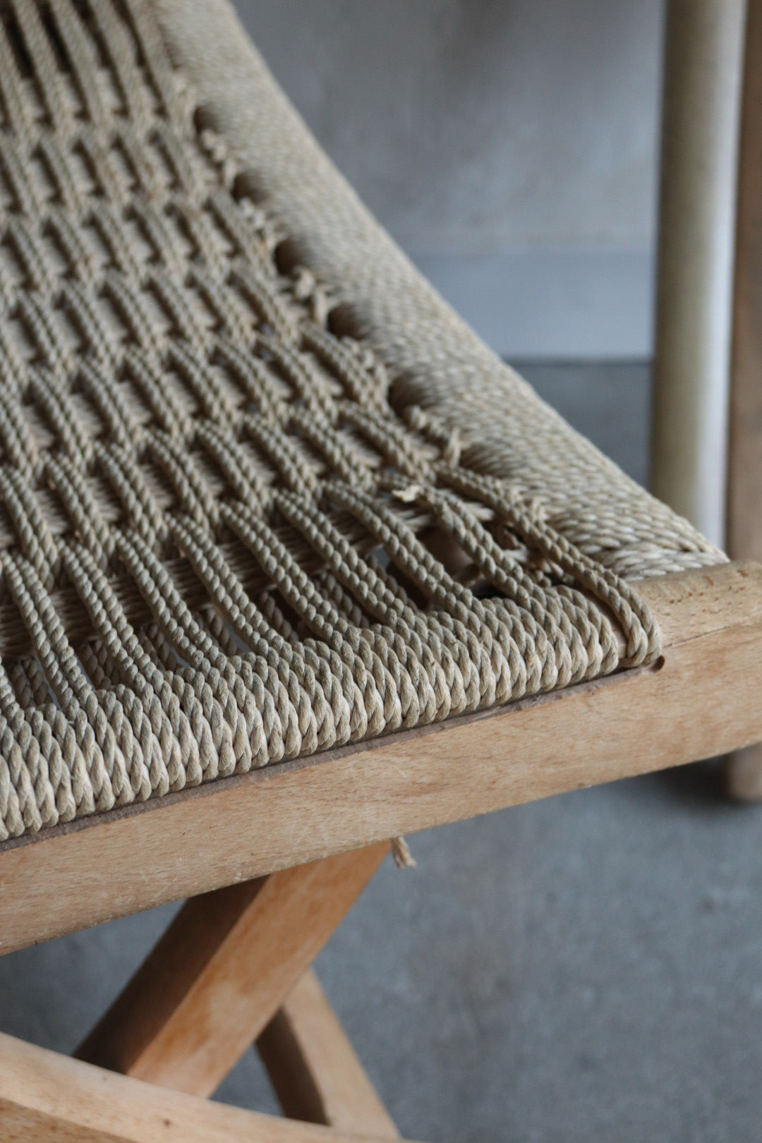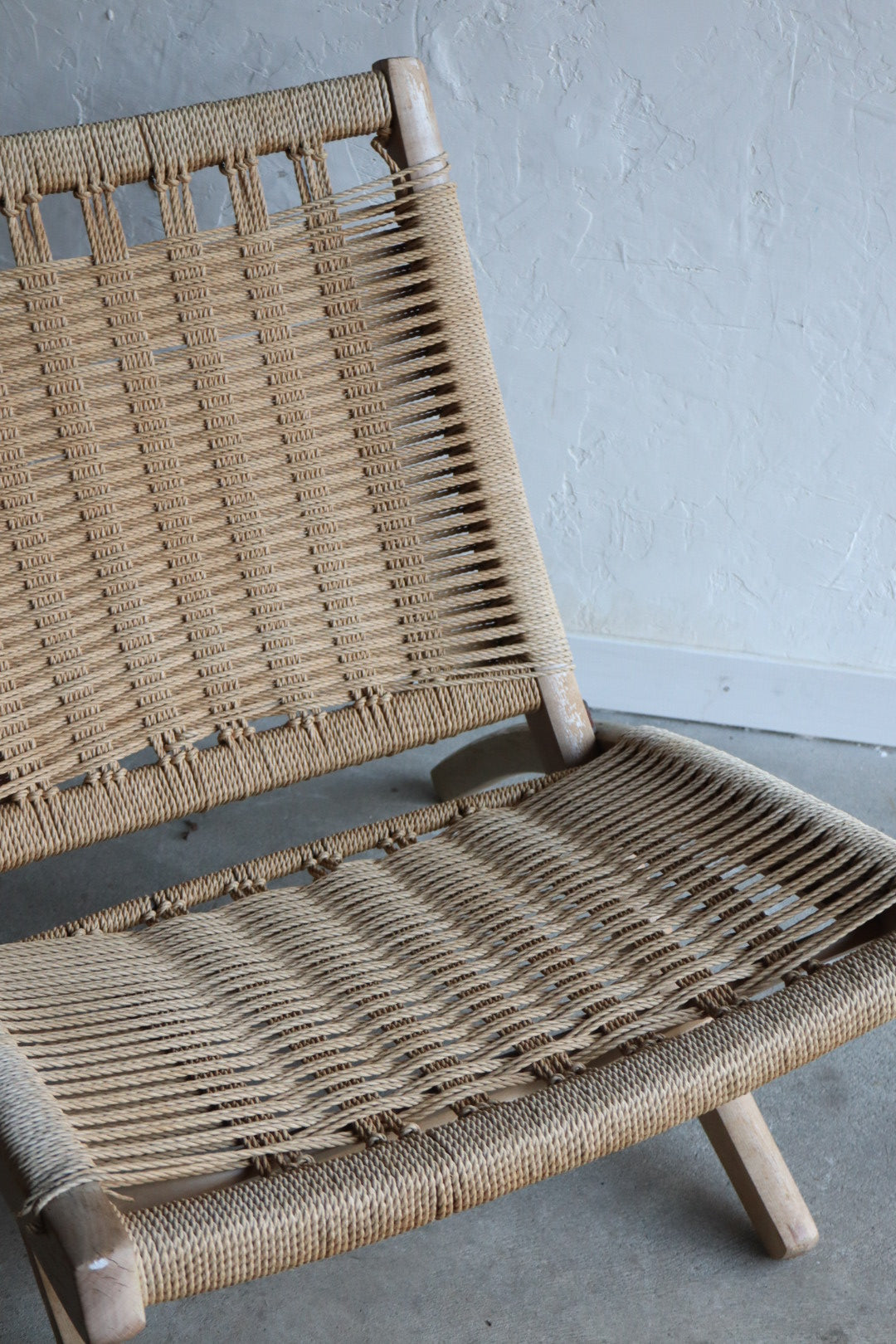 1960s folding lounge chair with ottoman in the style of Hans Wegner. Solid wood frame shows signs of wear and some breakage in woven cord. Fully functional as is with lots of life left, very comfortable. Made in Yugoslavia