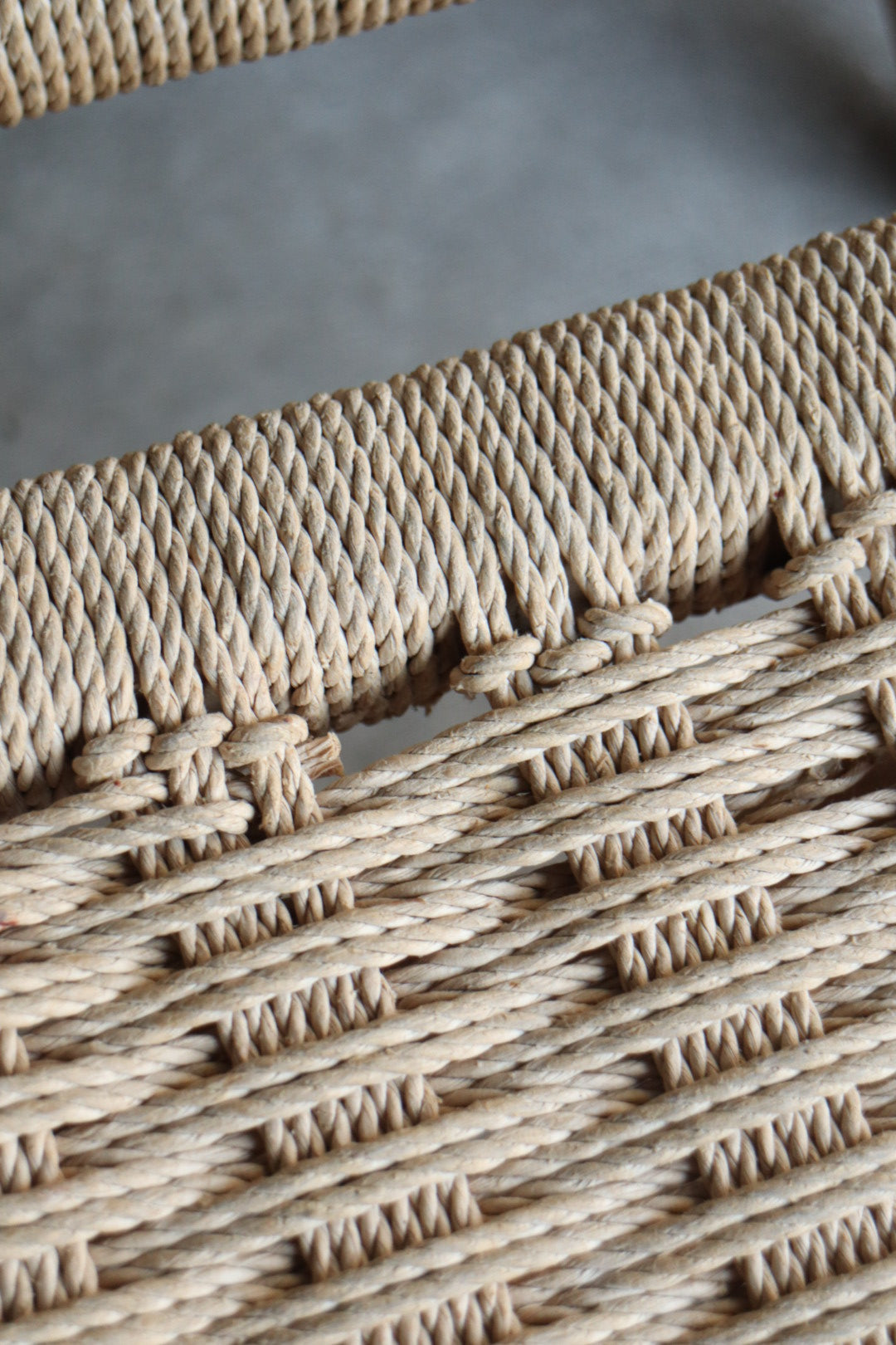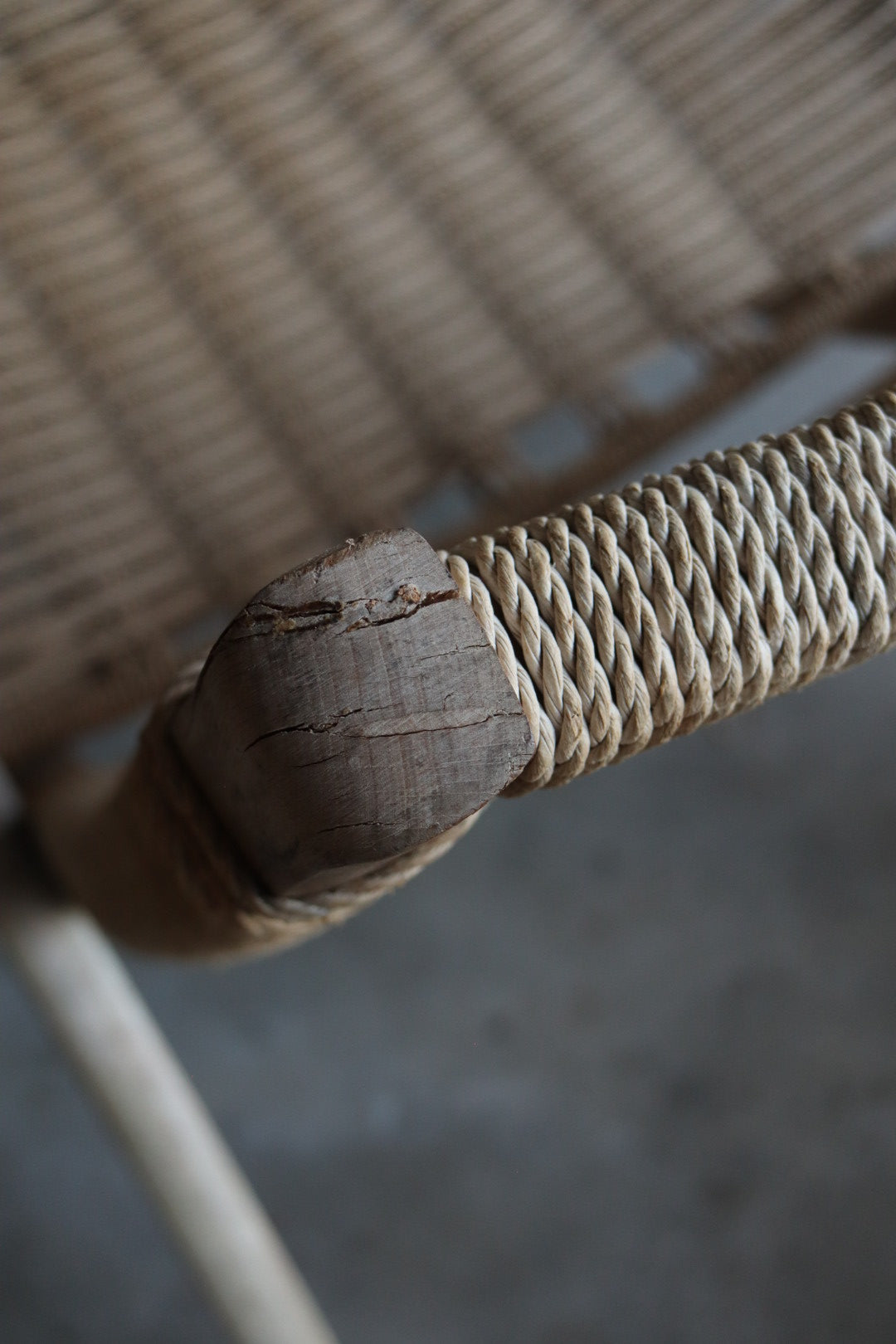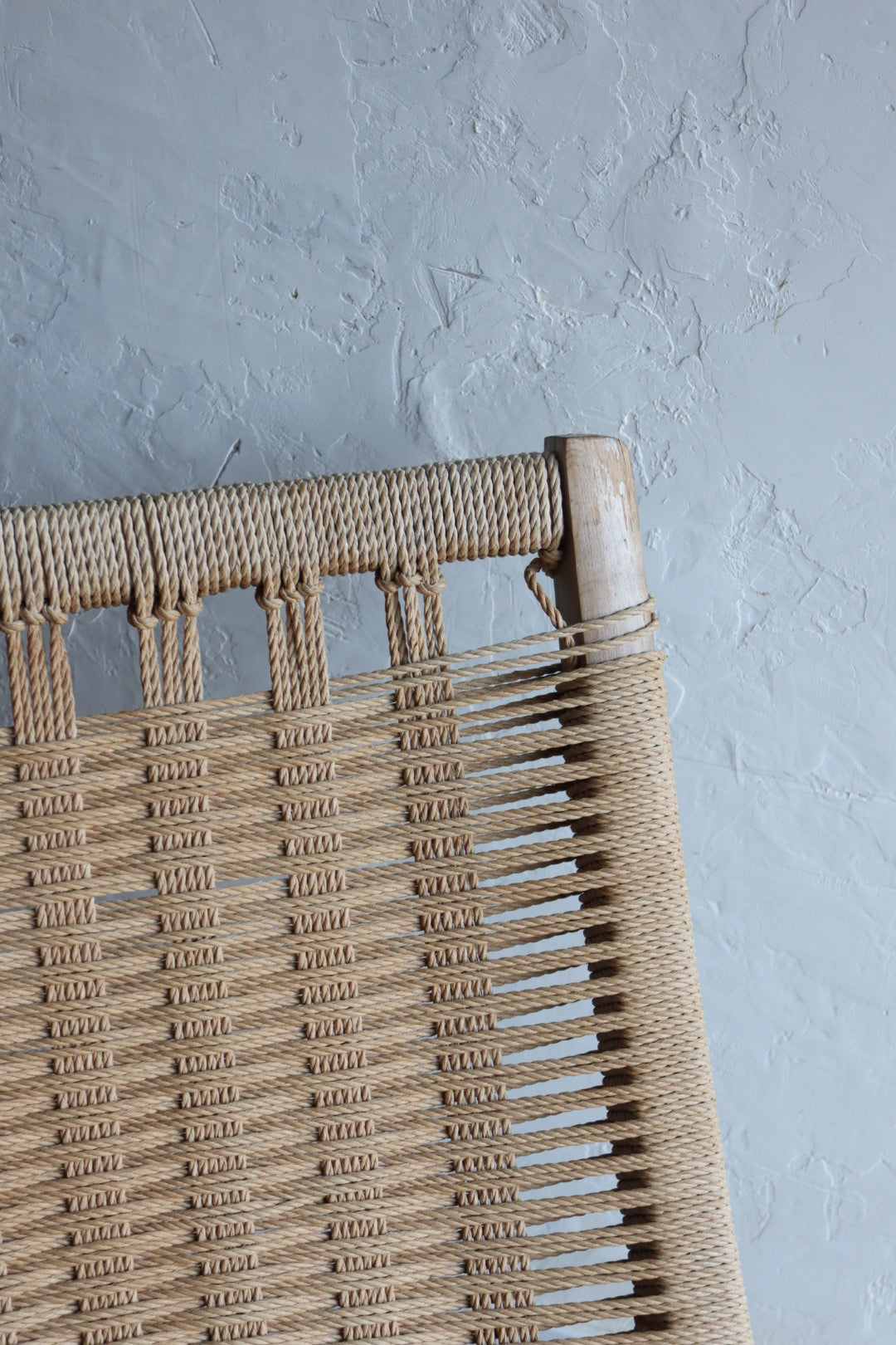 1960s folding lounge chair with ottoman in the style of Hans Wegner. Solid wood frame shows signs of wear and some breakage in woven cord. Fully functional as is with lots of life left, very comfortable. Made in Yugoslavia