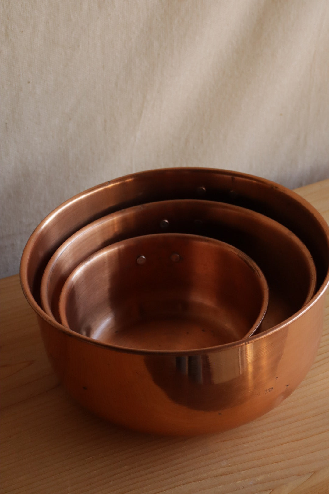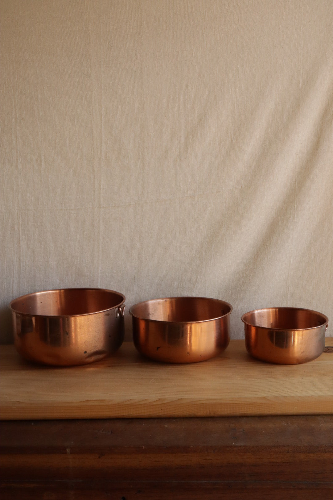 Set of 3 copper mixing nesting bowls. Made in Taiwan. Some patina, and dents, see photos.
