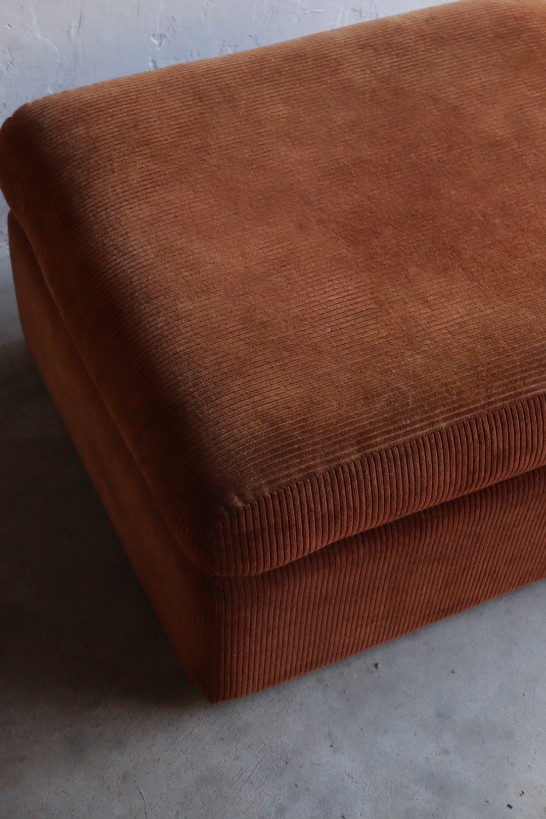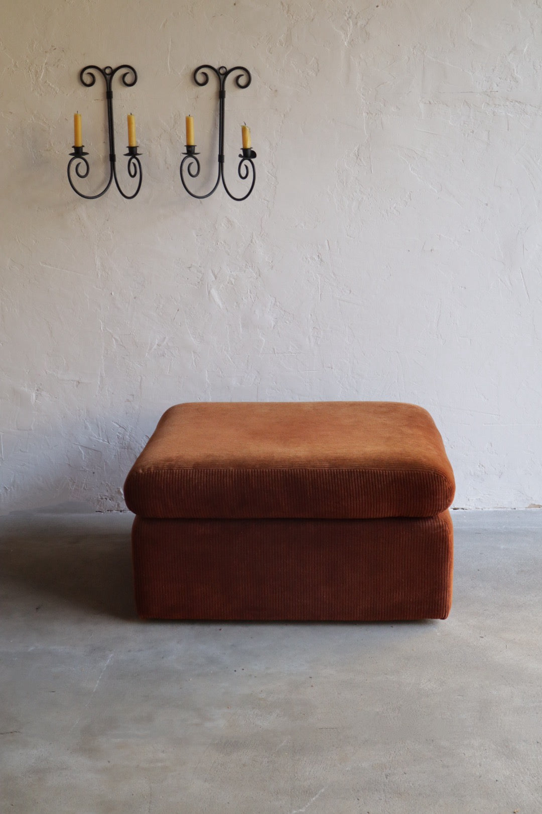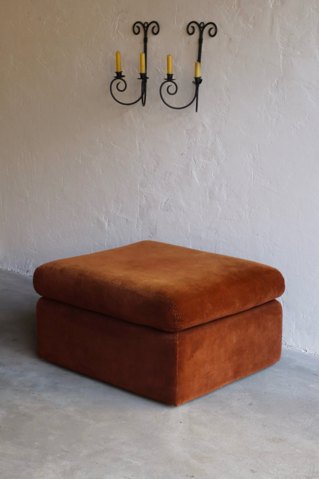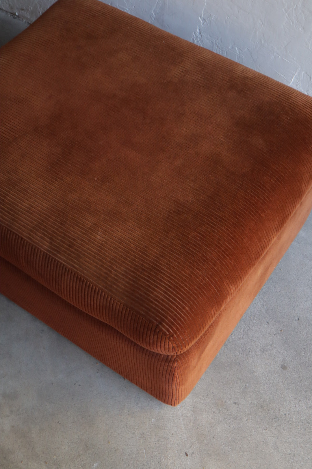 Vintage ottoman in a rich rust corduroy. Some light fading and wear to top. Overall great vintage condition.
