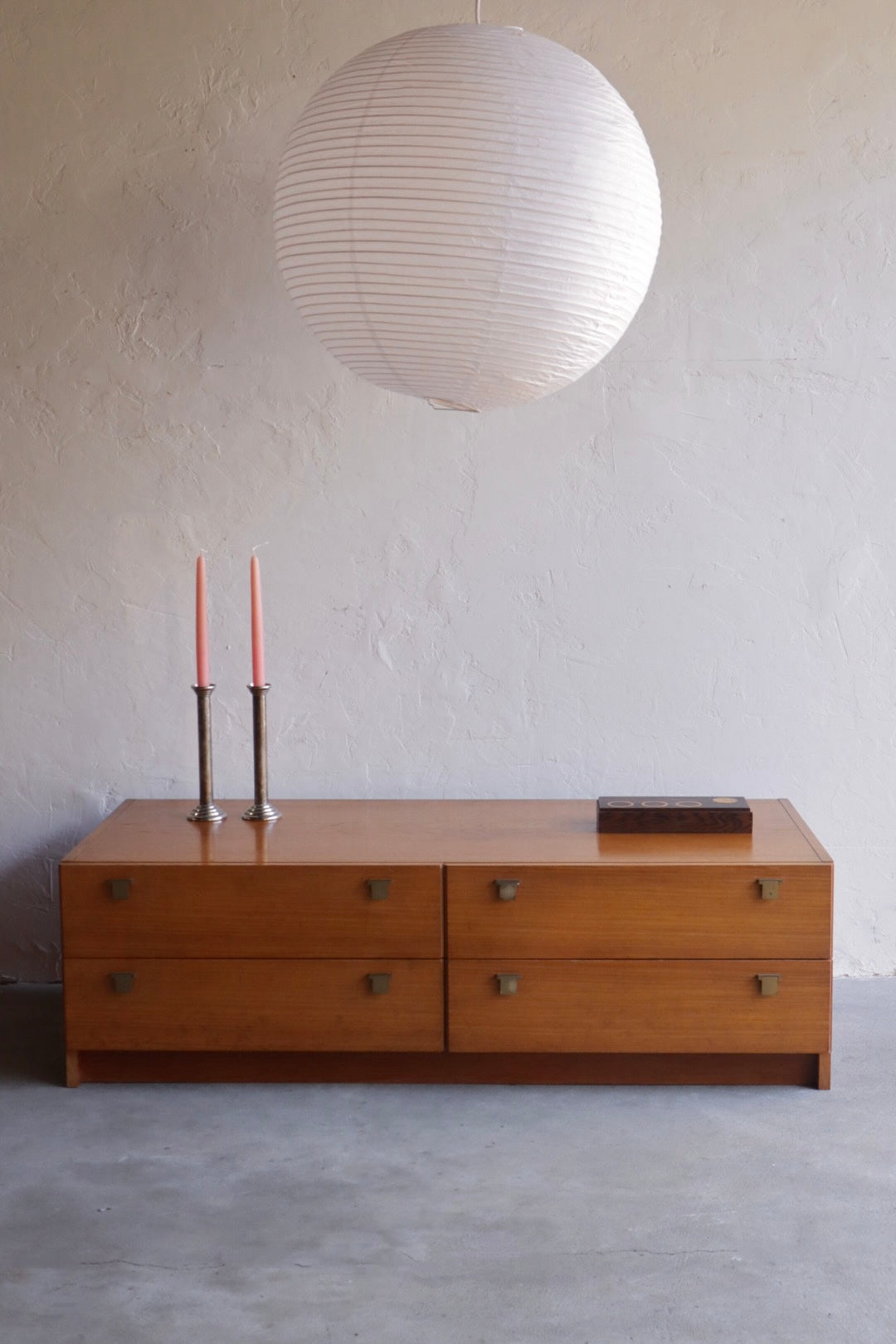 1960s low profile teak console/chest of drawers. Deep surface provides ample space for a media console or bench, with plenty of hidden drawer storage. Surface scratching mostly on bottom drawers, small chips on base & patina on brass pulls. See photos for full details.