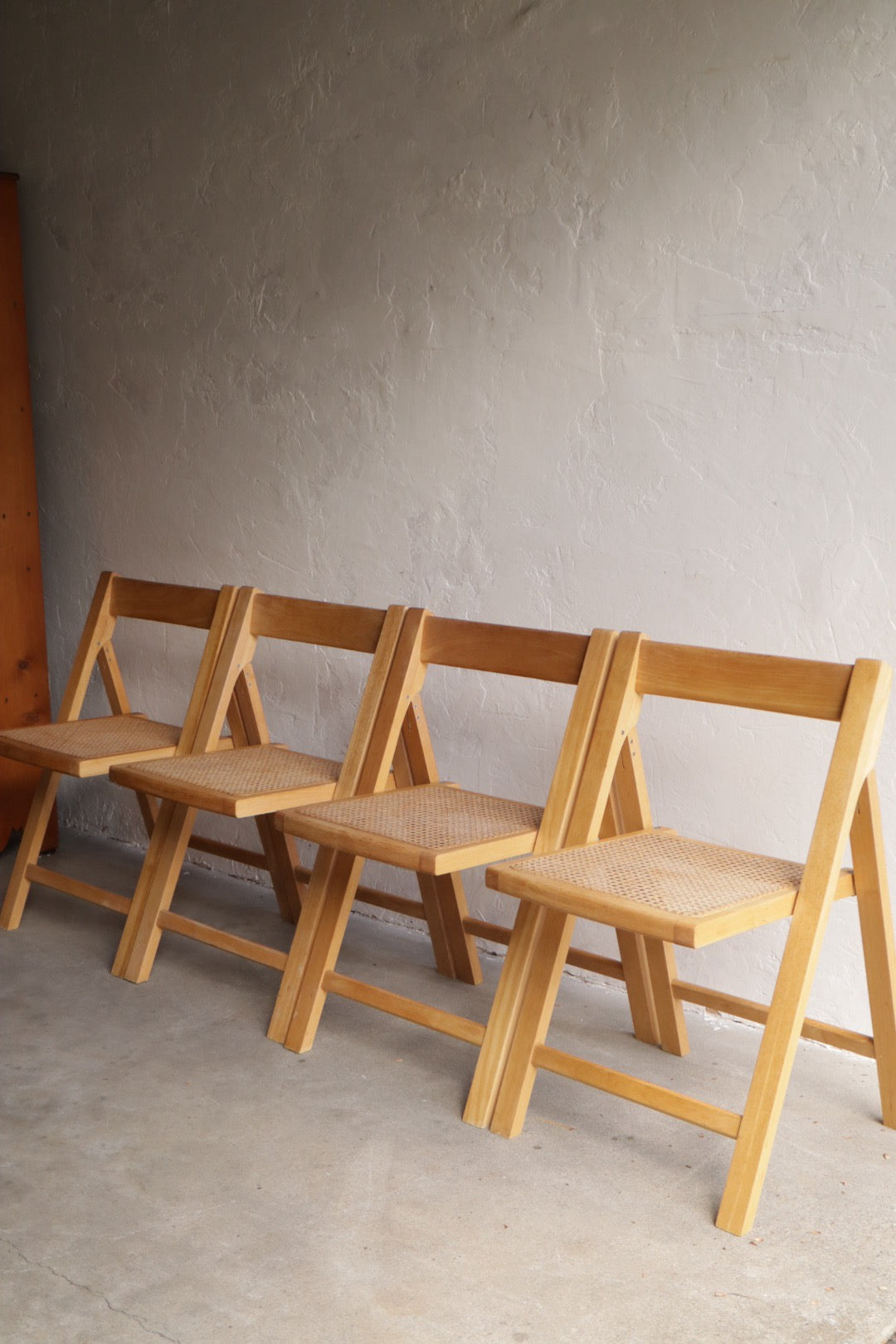 Set of 4 Aldo Jacober style folding chairs with cane seats. Cane is in excellent condition, wood frames show light signs of wear.