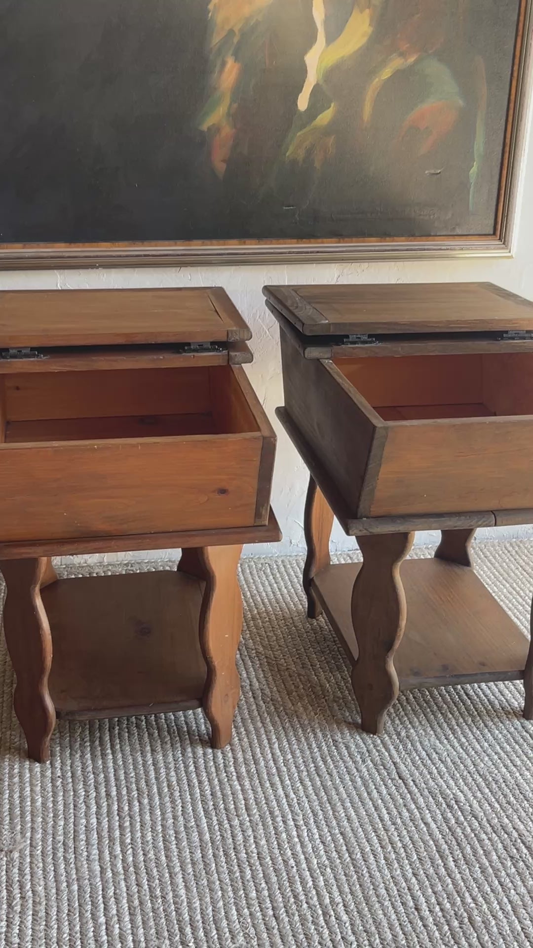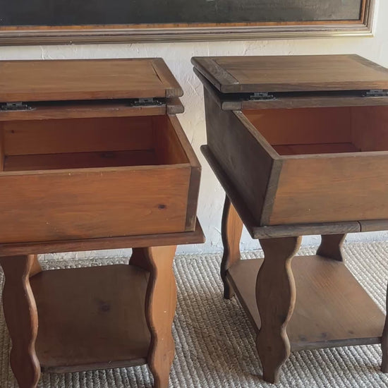 1950s/60s ‘dough box’ side tables. Perfect use for nightstands or end tables with lots of storage and lower shelf. Pine with iron hinges. Wear reflects age and use, fully functional with a some surface wear.