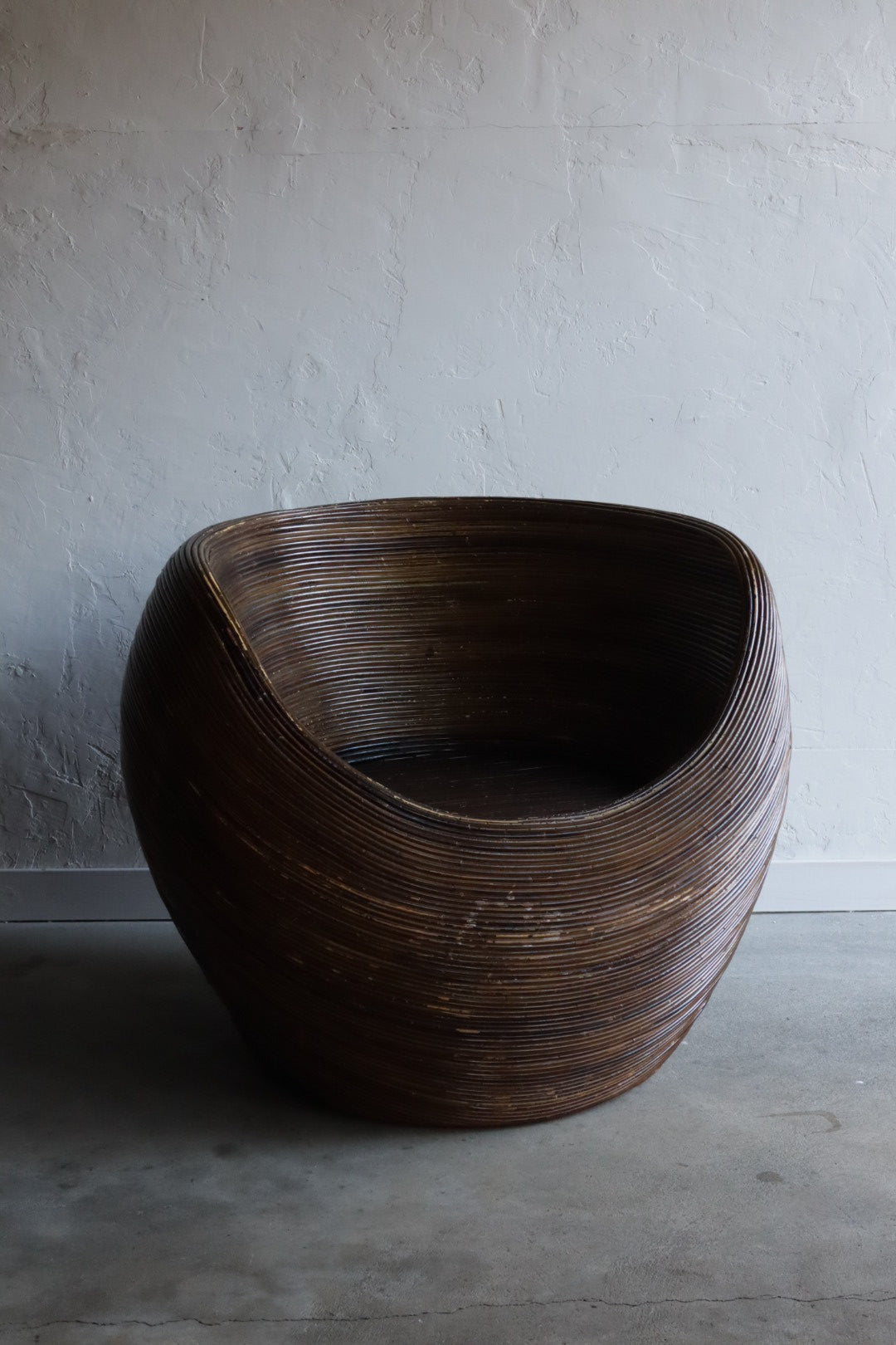 Vintage pencil reed pod chair in the style of Gabriella Crespi. The chair’s unique rounded shape is consructed of steam bent bamboo. Light wear to finish throughout, no breaks in bamboo, chair is fully functional and very comfortable - please see photos for details.