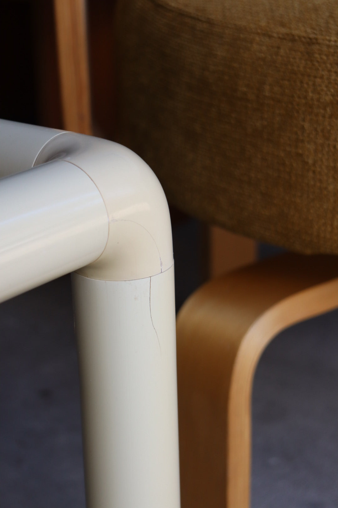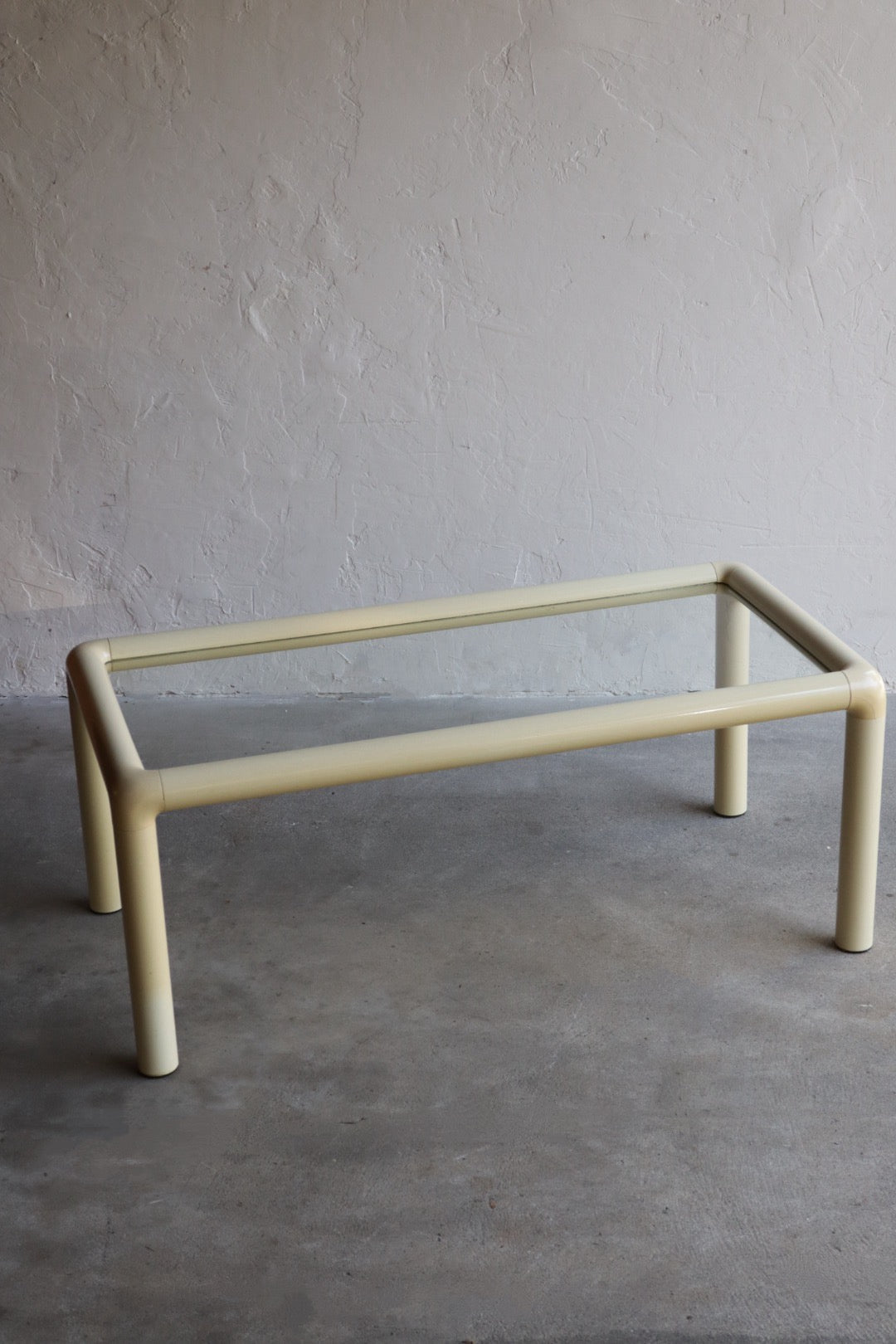 Table shows signs of wear including small cracks on one leg, slight yellowing to plastic. Glass is in excellent condition. Fully functional. See photos for details.