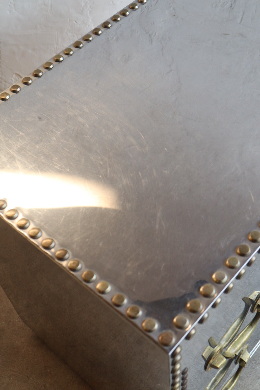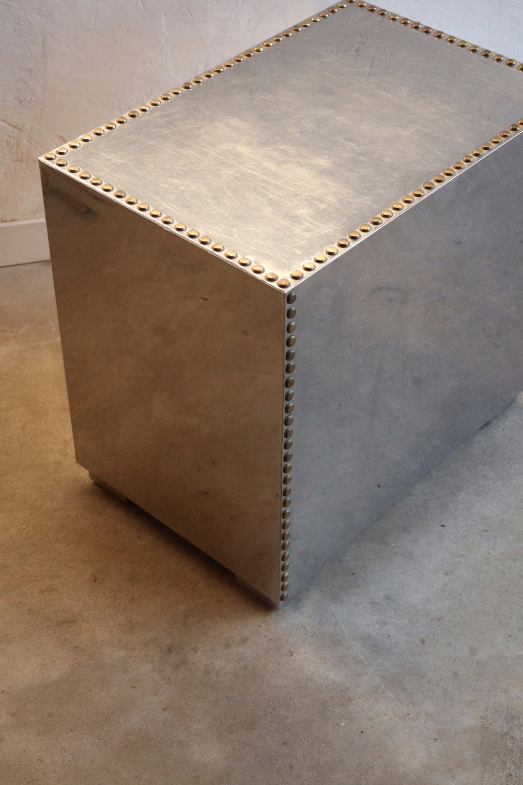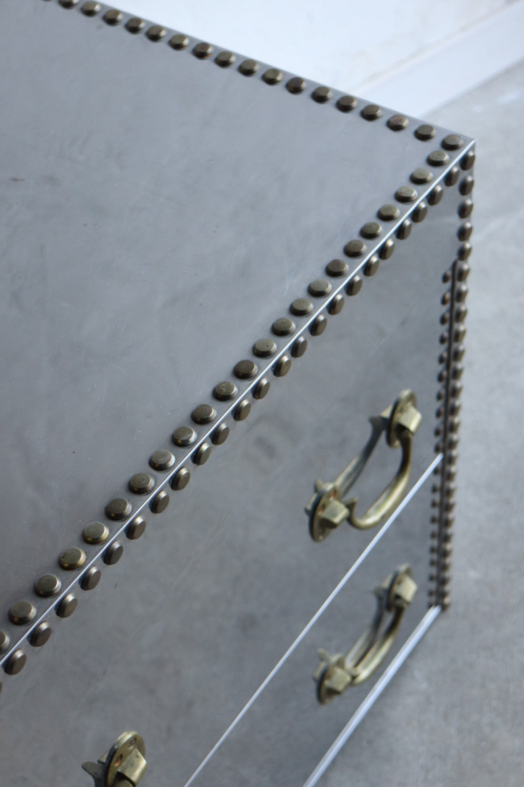 1970s polished steel chest of drawers with brass tack heads and pulls. Lined in red velvet-like fabric. Excellent condition for age with some scratching/wear.