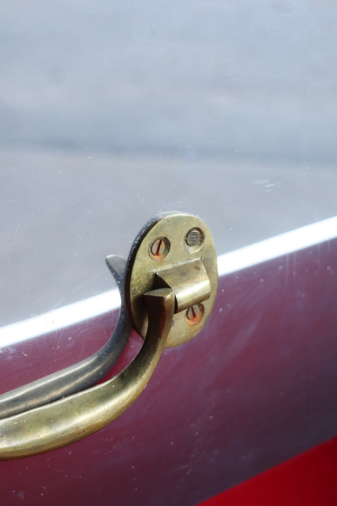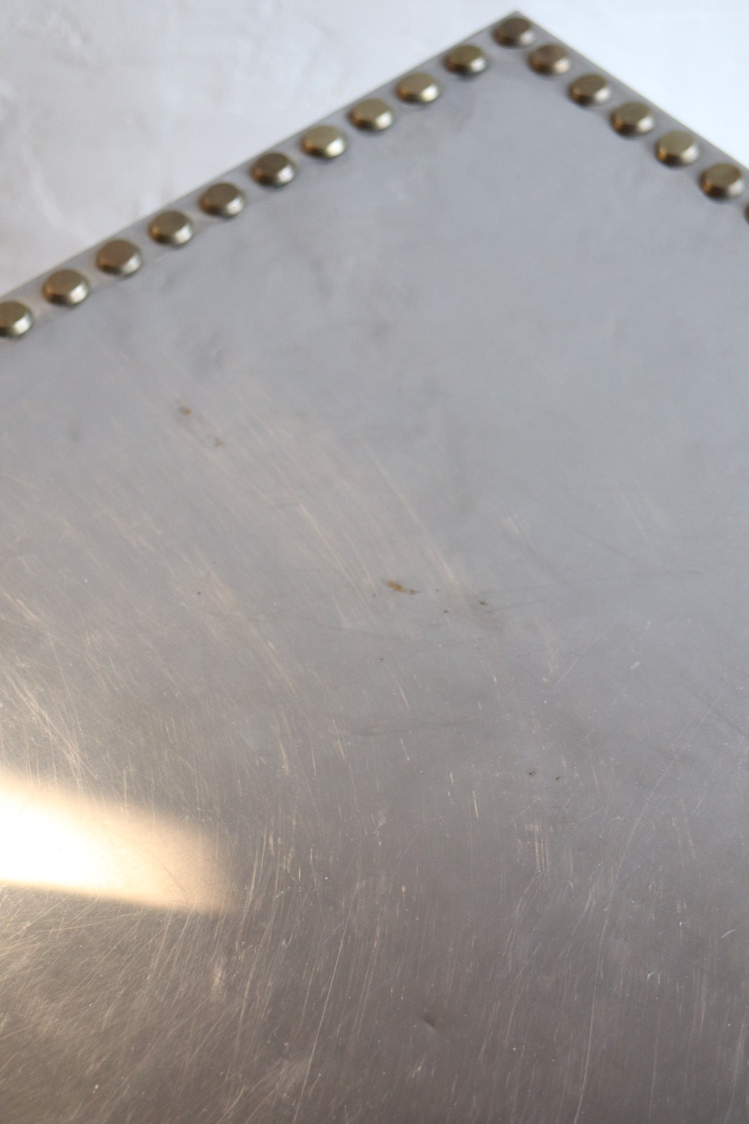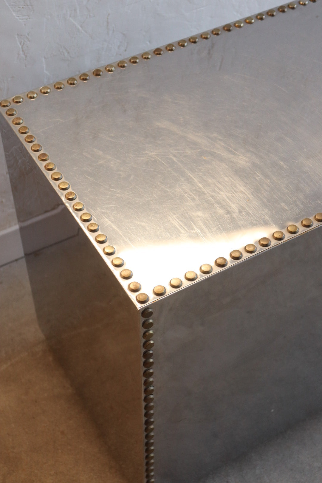 1970s polished steel chest of drawers with brass tack heads and pulls. Lined in red velvet-like fabric. Excellent condition for age with some scratching/wear.