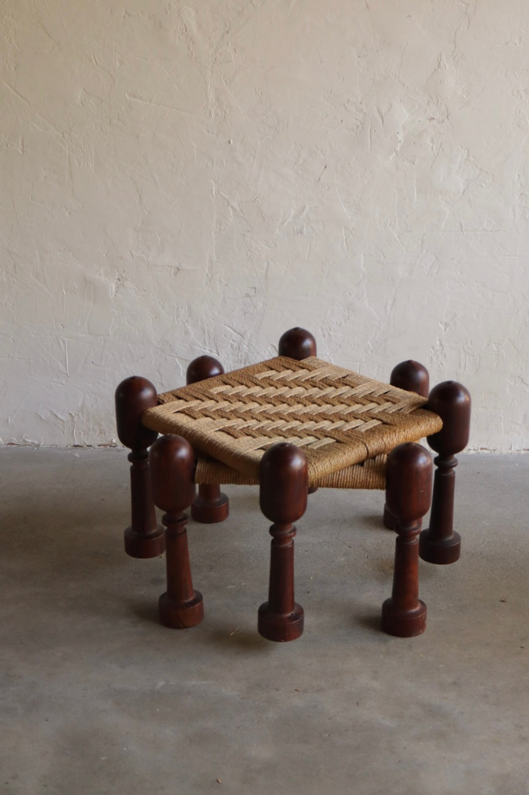 Pair of jute & rosewood stacking stools. Small mark on jute and light wear to wood, see photos for details. Great condition overall.